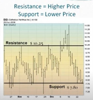 - Resistance is the higher price of the stock, where historically, the price began to move back down.